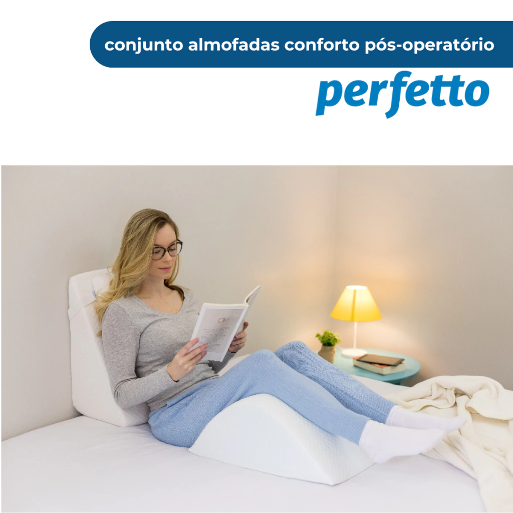 Composto por duas peças essenciais — Encosto Triangular Ortopédico e Almofada Apoio de Pernas — o kit garante a posição ideal do corpo no pós-operatório, reduz o desconforto dos primeiros dias e melhora consideravelmente a qualidade do repouso.