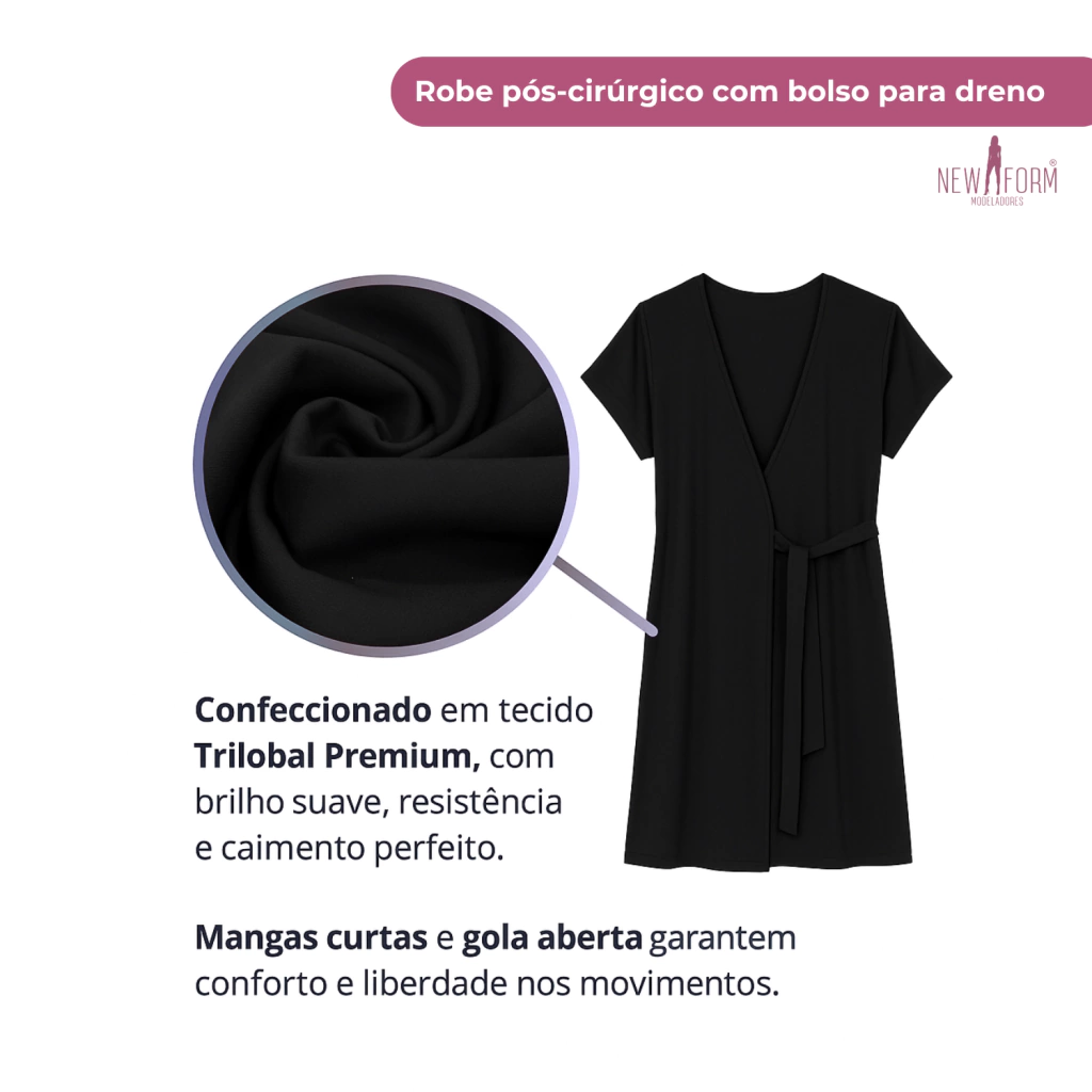 O Robe Pós-Cirúrgico com Bolso para Dreno New Form foi especialmente desenvolvido para proporcionar conforto, segurança e praticidade durante o processo de recuperação após cirurgias como abdominoplastia, mastopexia, mamoplastia redutora, lipoaspiração ou outros procedimentos que exigem cuidado contínuo.