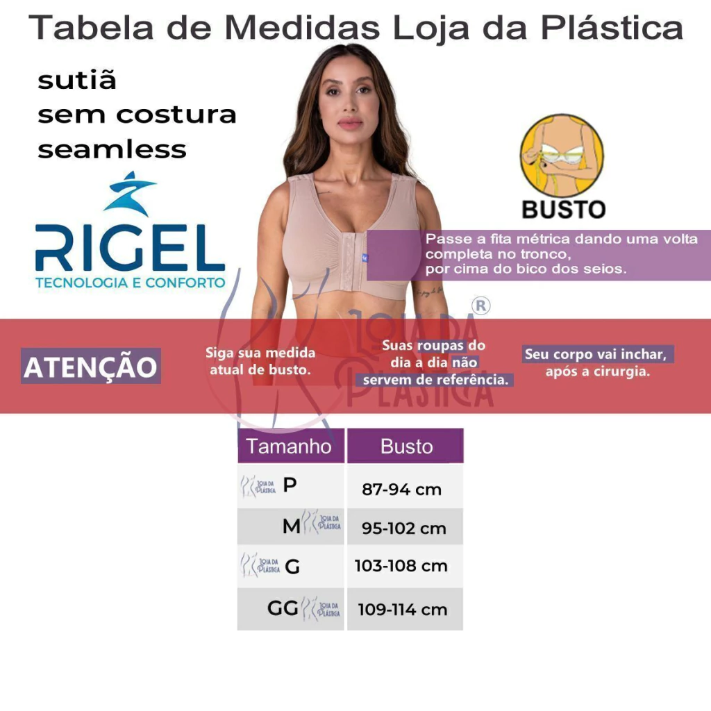 O sutiã pós-cirúrgico sem costura seamless Rigel , vendido pela Loja da Plástica, possui compressão balanceada nas regiões que mais precisa, como seios e laterais.