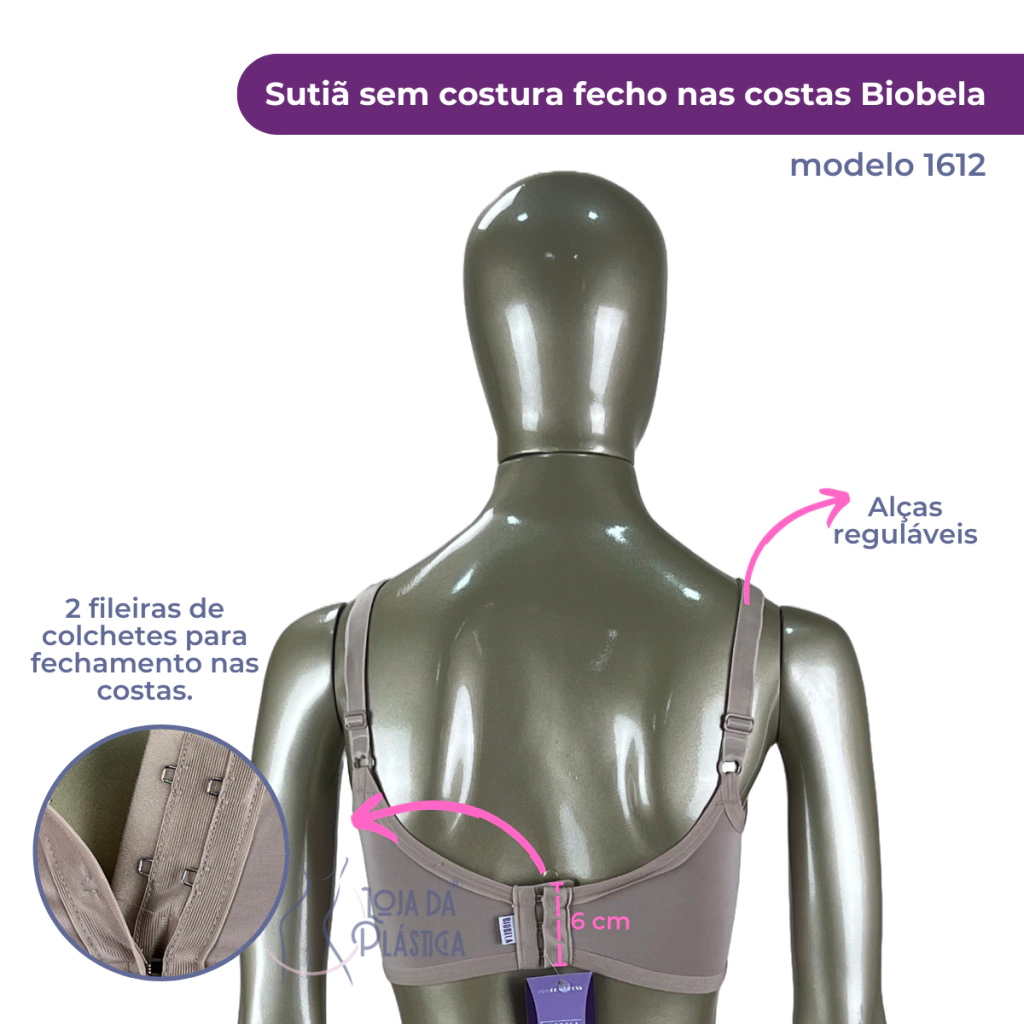 A Loja da Plástica traz para você o sutiã top sem costura com fecho nas costas Biobela, ideal para ser usado no pós-cirúrgico tardio de mamoplastia, prótese de silicone e mastopexia.